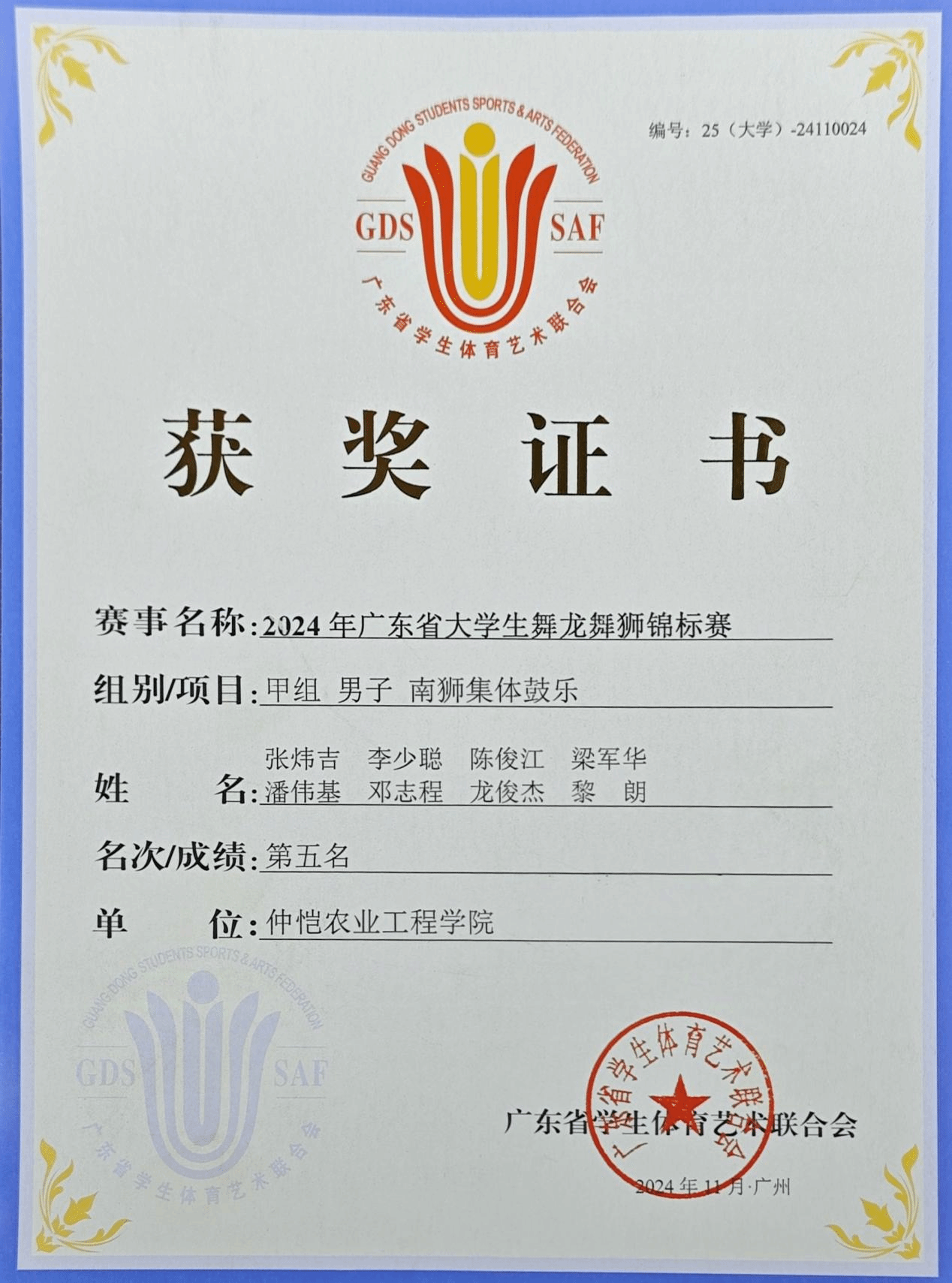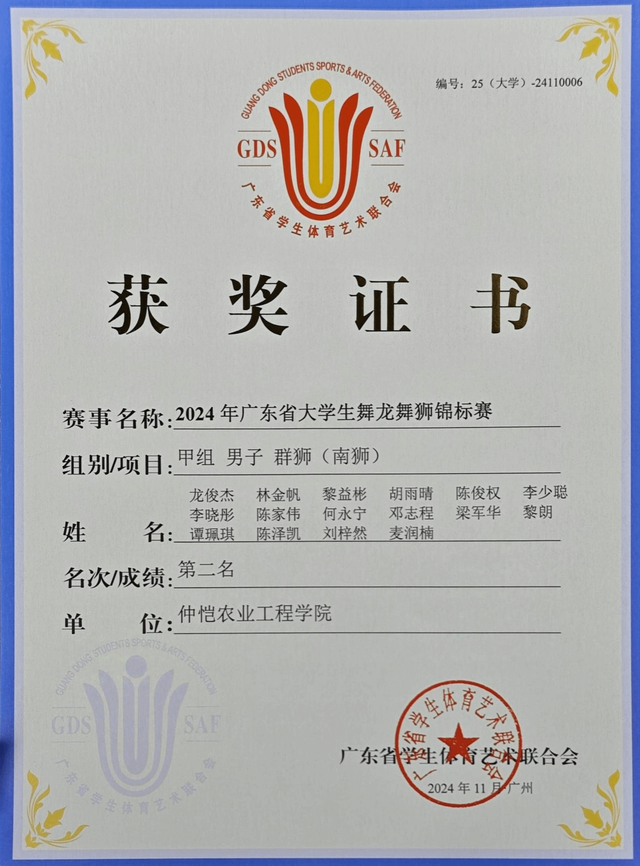 在本次广东省大学生舞龙舞狮锦标赛中,我队展现了高超的技艺和不屈不挠的竞技精神。队员们用自己的方式,将龙狮的灵动与威猛展现得淋漓尽致,收获了现场观众的热烈喝彩以及评审团的高度赞誉。在每一次翻腾与跃动中,队员们均展现出饱满的力量与高超的技艺,他们的登台表演,不仅是对平日刻苦训练的深刻诠释,更是对完美表现自我的极致追求。在激烈的赛场上,队员们淋漓尽致地展现了仲恺学子的优秀风采,完美诠释了“习武强德,克己明志”的传统队训,将龙狮文化的魅力与团队的风采完美融合。他们所取得的耀眼成绩,既是个人的荣誉,也是学校全体师生的荣耀!
