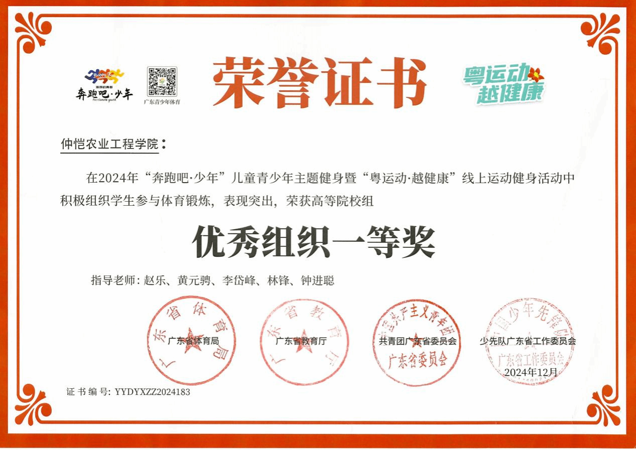 为深入学习贯彻党的二十大精神,牢固树立“健康第一”的理念,进一步推动青少年体育活动广泛、深入开展,提升儿童青少年科学健身意识,促进儿童青少年德智体美劳全面发展。2024年10月17日至11月24日,由国家体育总局指导,广东省体育局、广东省教育厅、共青团广东省委员会、少先队广东省工作委员会共同发起,举办2024年“奔跑吧•少年”儿童青少年主题健身暨“粤运动·越健康”线上运动健身活动。在收到“线上运动健身活动”的文件后,304永利集团高度重视,及时通知全体仲恺学子,响应号召,积极参加“线上运动健身活动 ”。在活动期间,304永利集团的老师经常关注全校学生的参与情况和学校在全省大专院校的排名情况,并鼓励、动员学生持续参与活动。经过全体师生的不懈努力,到11月24日活动结束时,学校荣获高等院校组“优秀组织一等奖”。这充分体现学校将“三全育人”“体育强健”计划真正落到实处,推动学校体育工作高质量发展的又一重要成果。