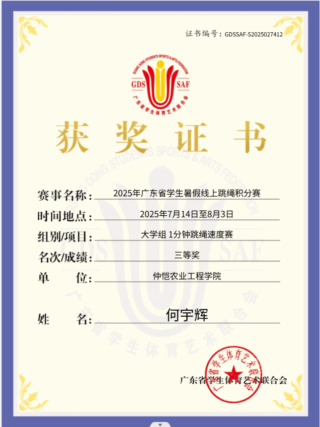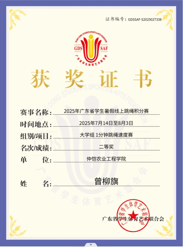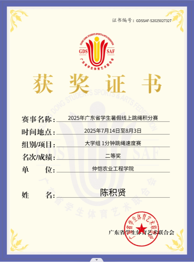由广东省学生体育艺术联合会主办、广东跳绳技术研究院承办的2025广东省学生暑假线上跳绳积分赛于2025年7月14日至8月3日期间举行。学校高度重视学生暑假期间课余运动锻炼,安排304永利集团负责以及各学院积极跟进,积极动员仲恺学子响应号召,积极参加比赛,在暑假期间养成居家运动健身的良好习惯,以良好的精神面貌迎接新学期的学习生活。