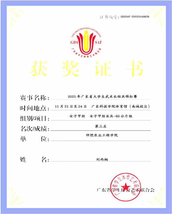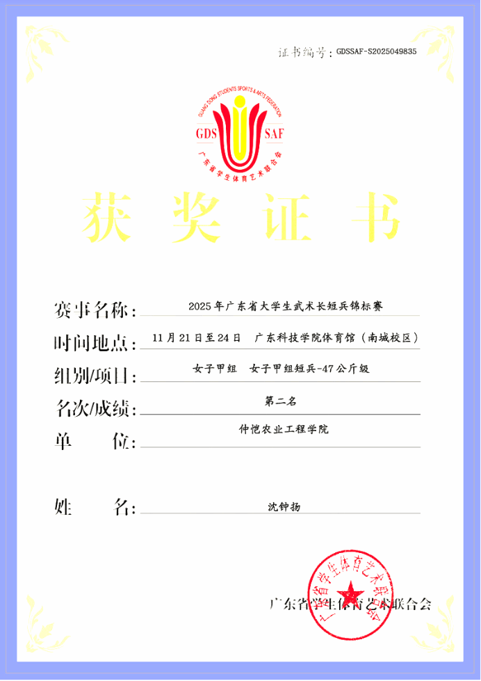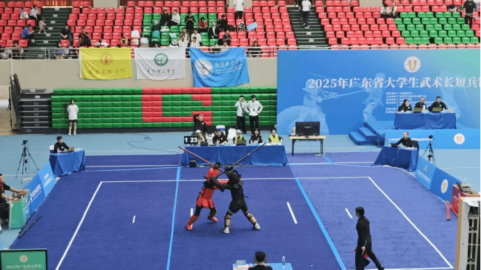 2025年广东省大学生武术长短兵锦标赛于11月21日至24日在广东科技学院(南城校区)举行。本届赛事规模创历届之最,共吸引40所高校的461名运动员参与角逐。比赛设甲组、乙A组、丙组三个组别,分设男子、女子各8个公斤级别,总计进行超过200场专业对抗。我校武术代表队在教练王玉立和黄继珍的率领下,派出6名运动员参赛。我校队员不负众望,凭借过硬的技术实力与顽强的拼搏精神,在全省高校劲旅中脱颖而出,斩获2银1铜,并实现全员获奖的好成绩。