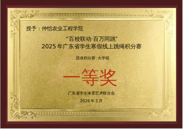 绳采飞扬跃寒假,我校学子创佳绩!近日,由广东省教育厅指导、广东省学生体育艺术联合会主办的“百校联动·百万同跳”2025年广东省学生寒假线上跳绳积分赛圆满收官。我校学子凭借饱满的竞技状态、过硬的身体素质和强大的团队向心力,在全省四十余所高校的激烈比拼中脱颖而出,一举摘得大学组团体积分赛一等奖,尽显仲恺学子体育风采。