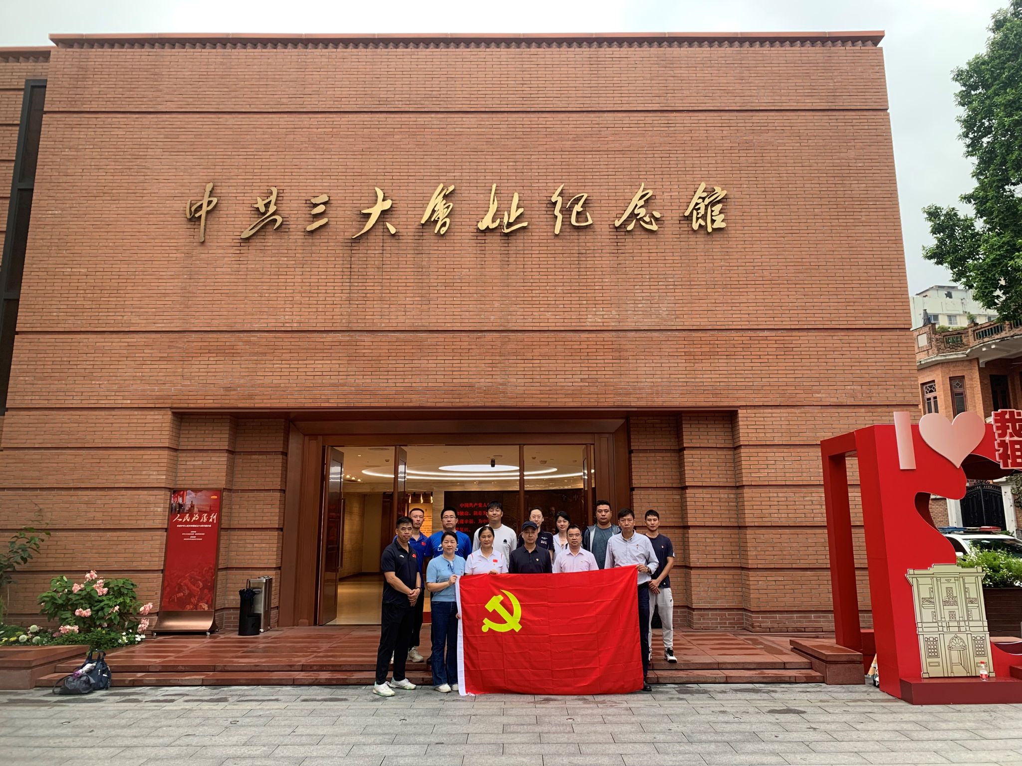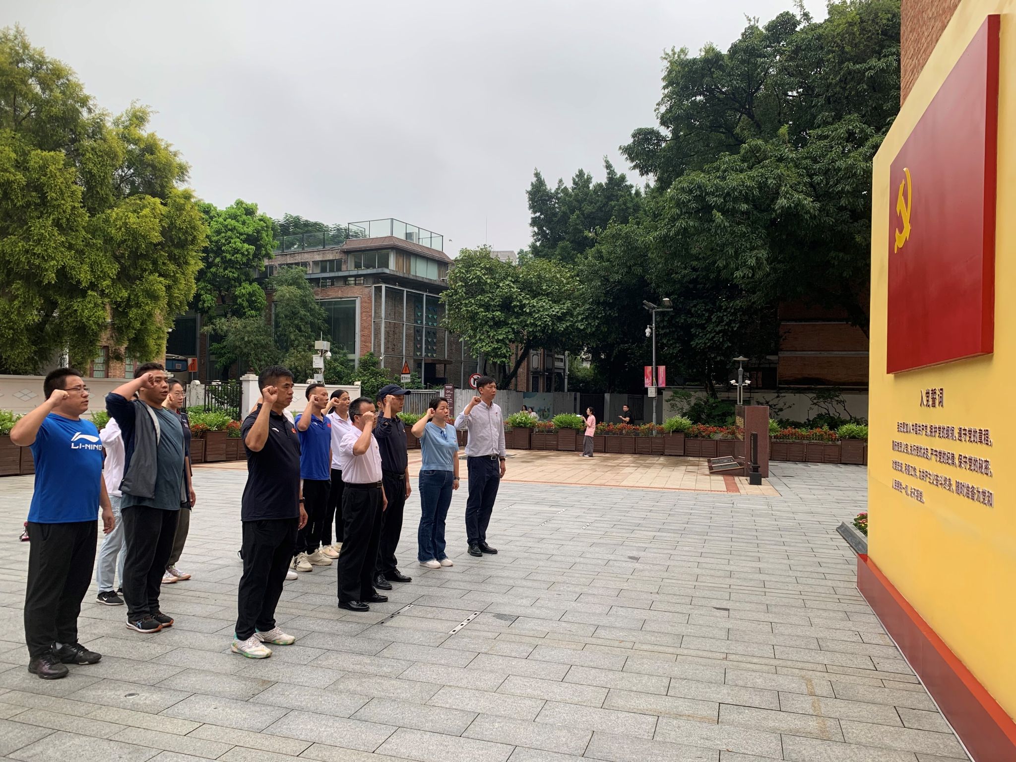 “我志愿加入中国共产党,拥护党的纲领,遵守党的章程,履行党员义务,执行党的决定......”在党总支书记何宝国的带领下,党员同志们举起右拳,在会址广场,面向鲜红的中国共产党党旗,重温入党誓词。