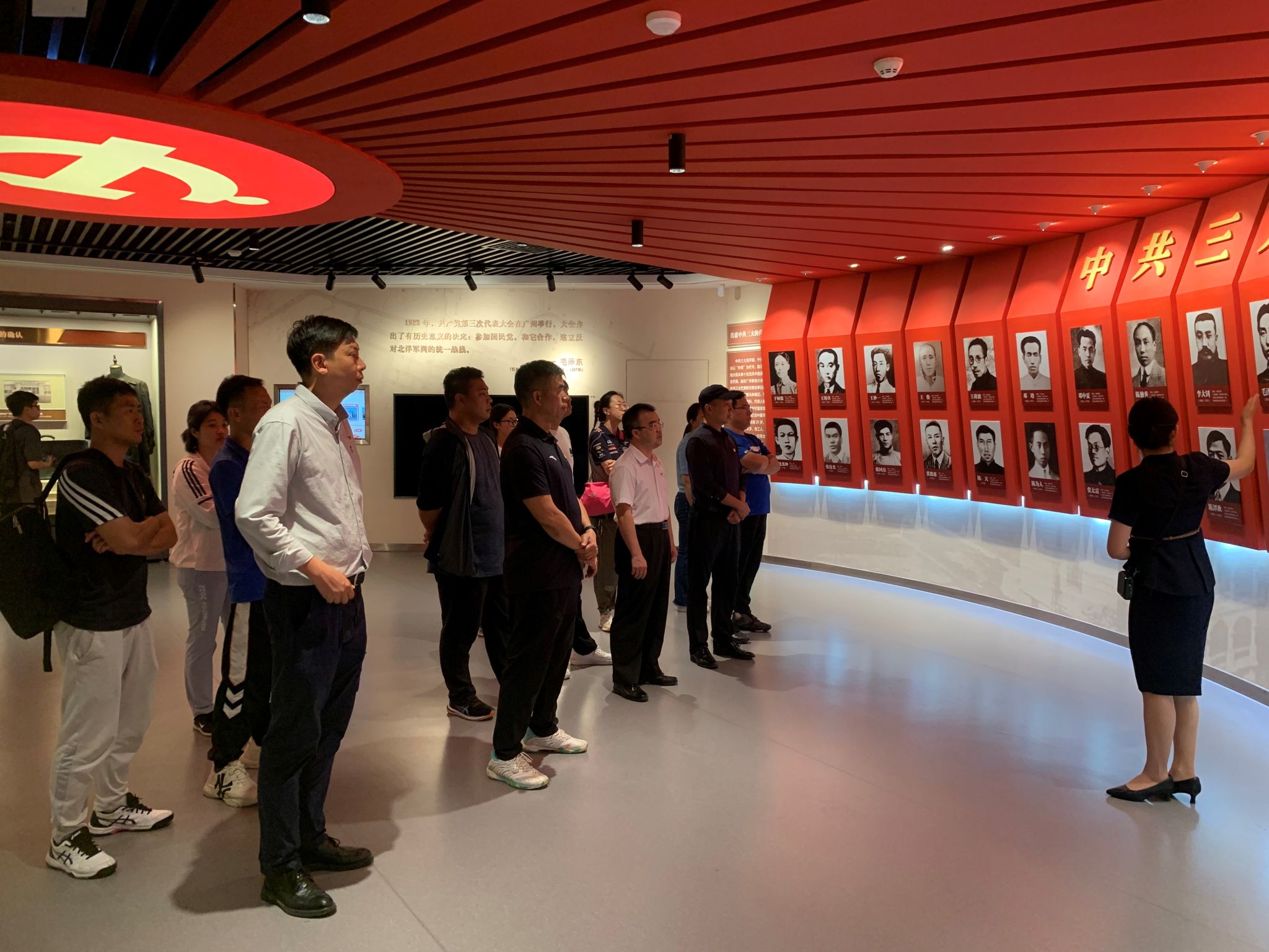 纪念馆内通过油画雕塑、文物、照片、图表、立体场景以及全息影像等新技术新方式,生动展现了中共三大召开的历史背景、会议过程与成果、以及其深远影响与重要贡献。在讲解员带领下,全体党员认真聆听讲解与观看。